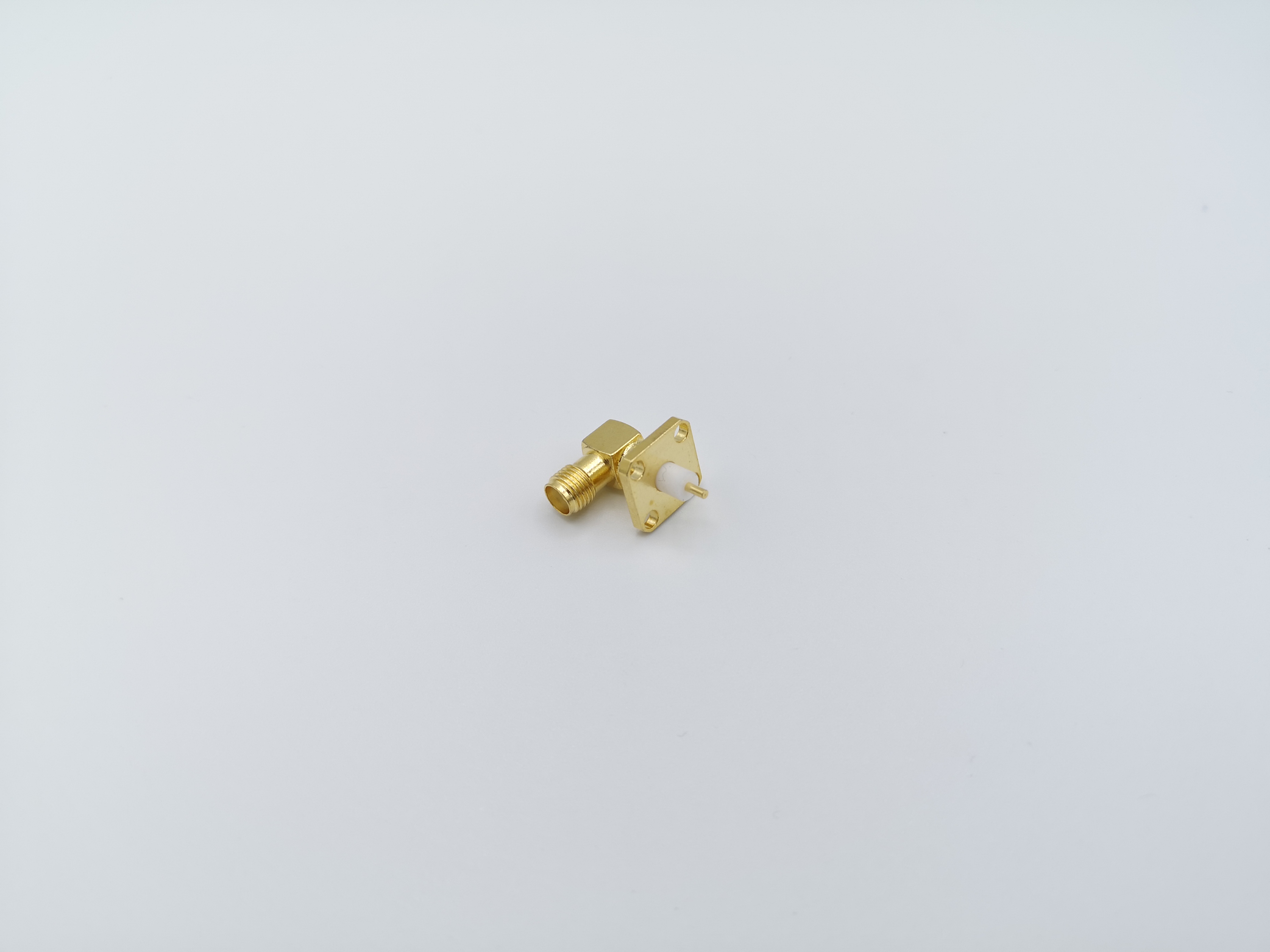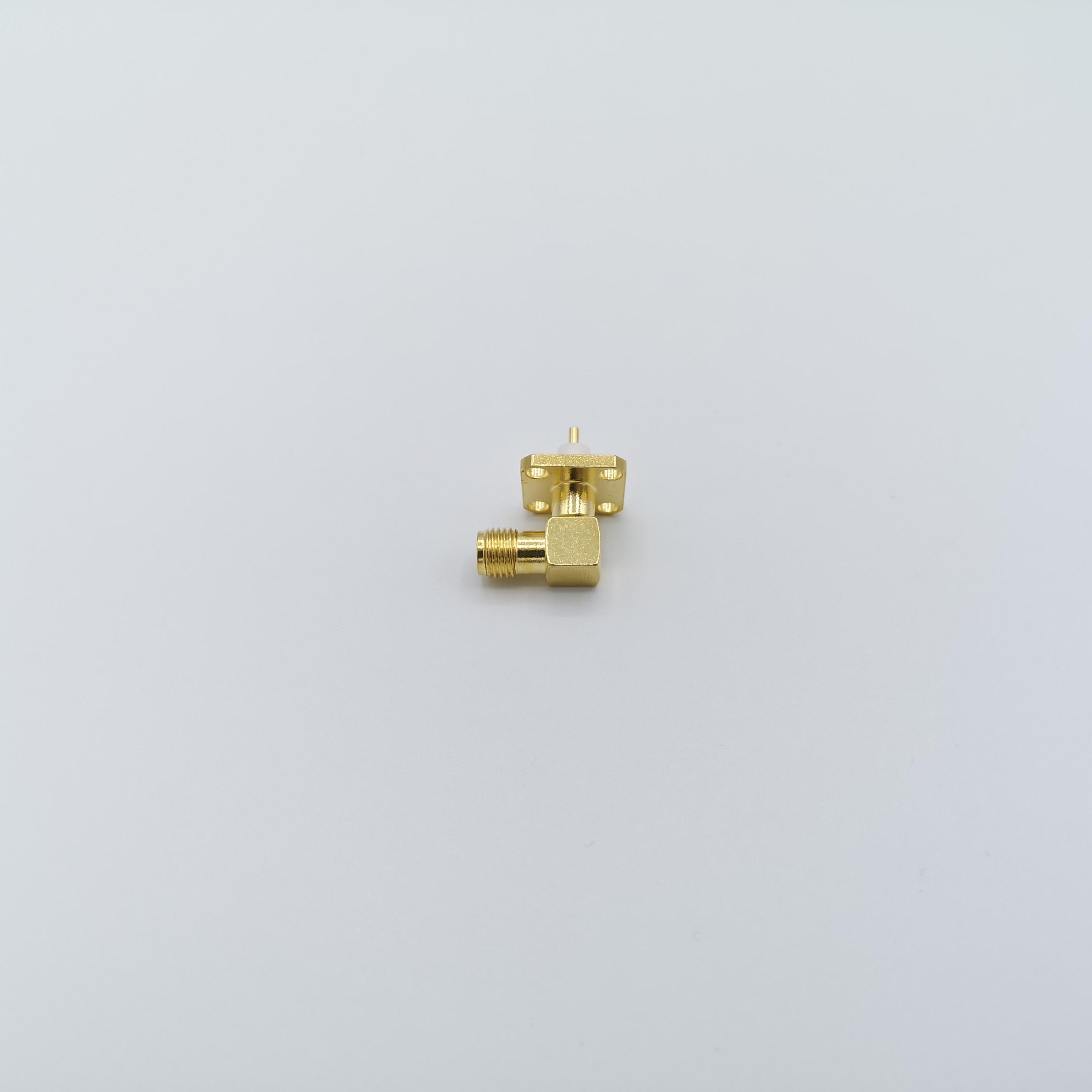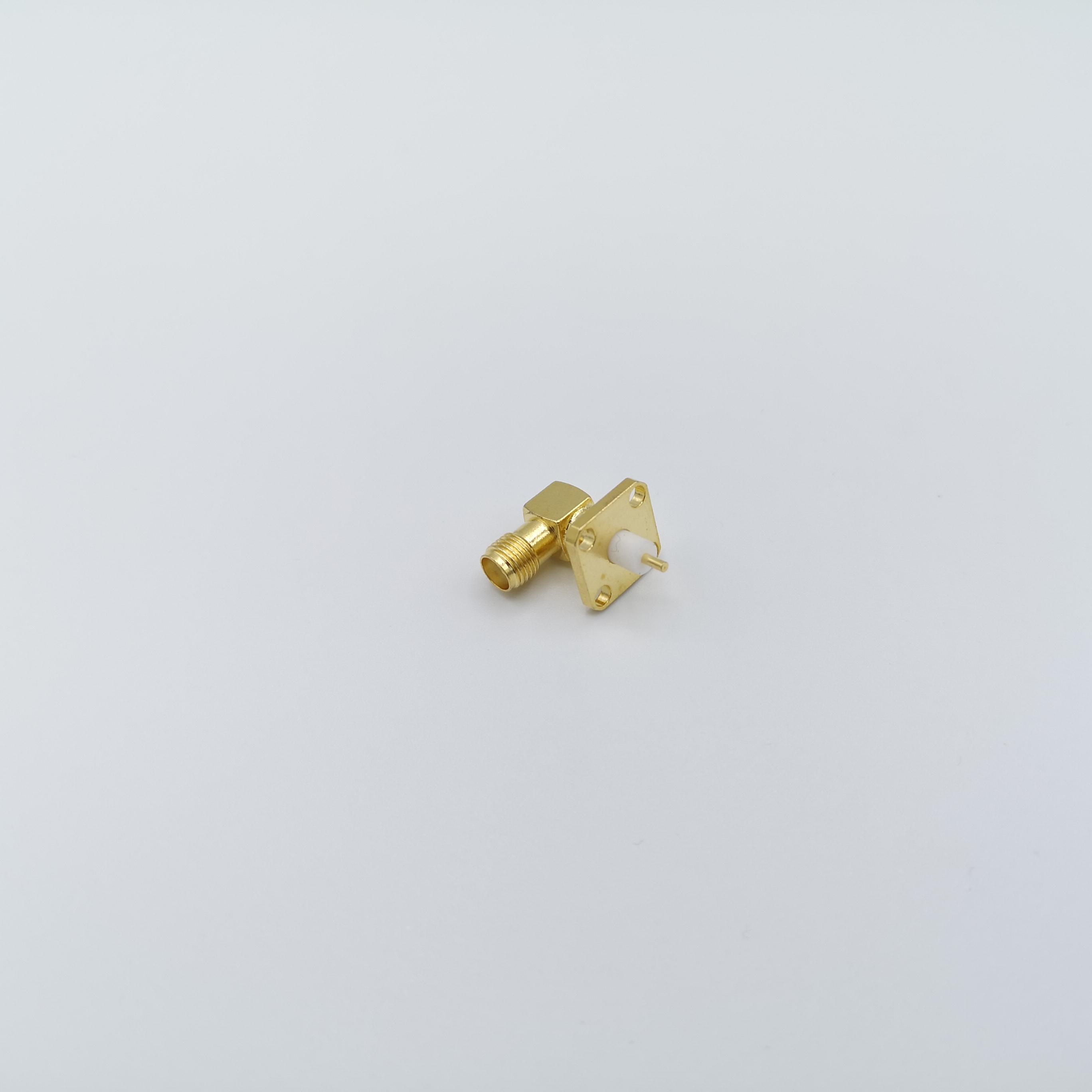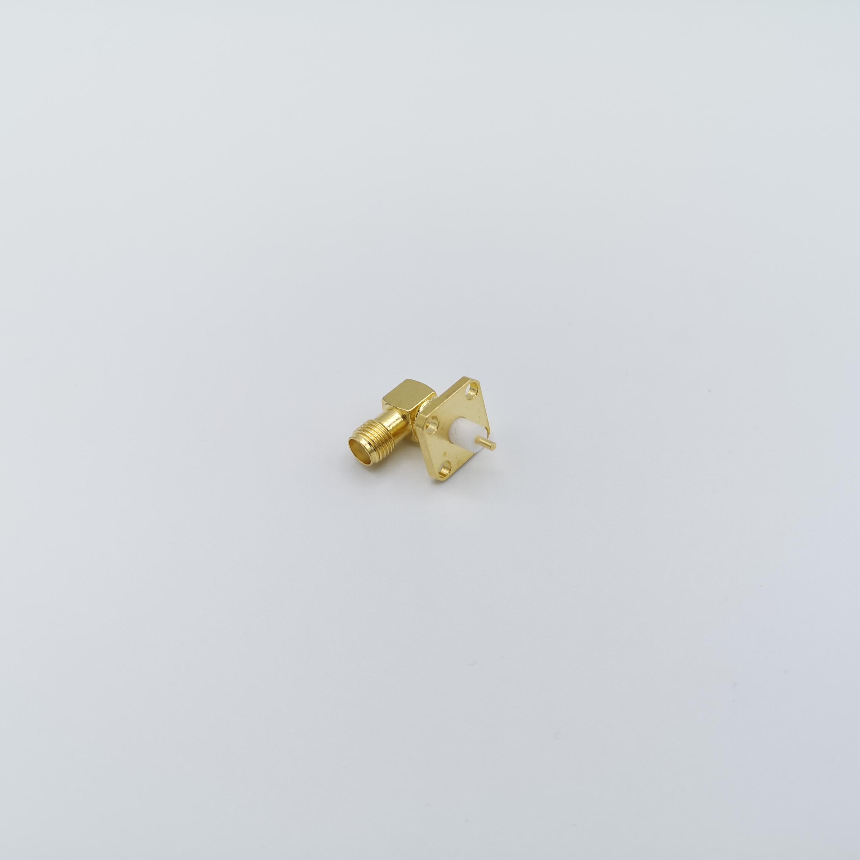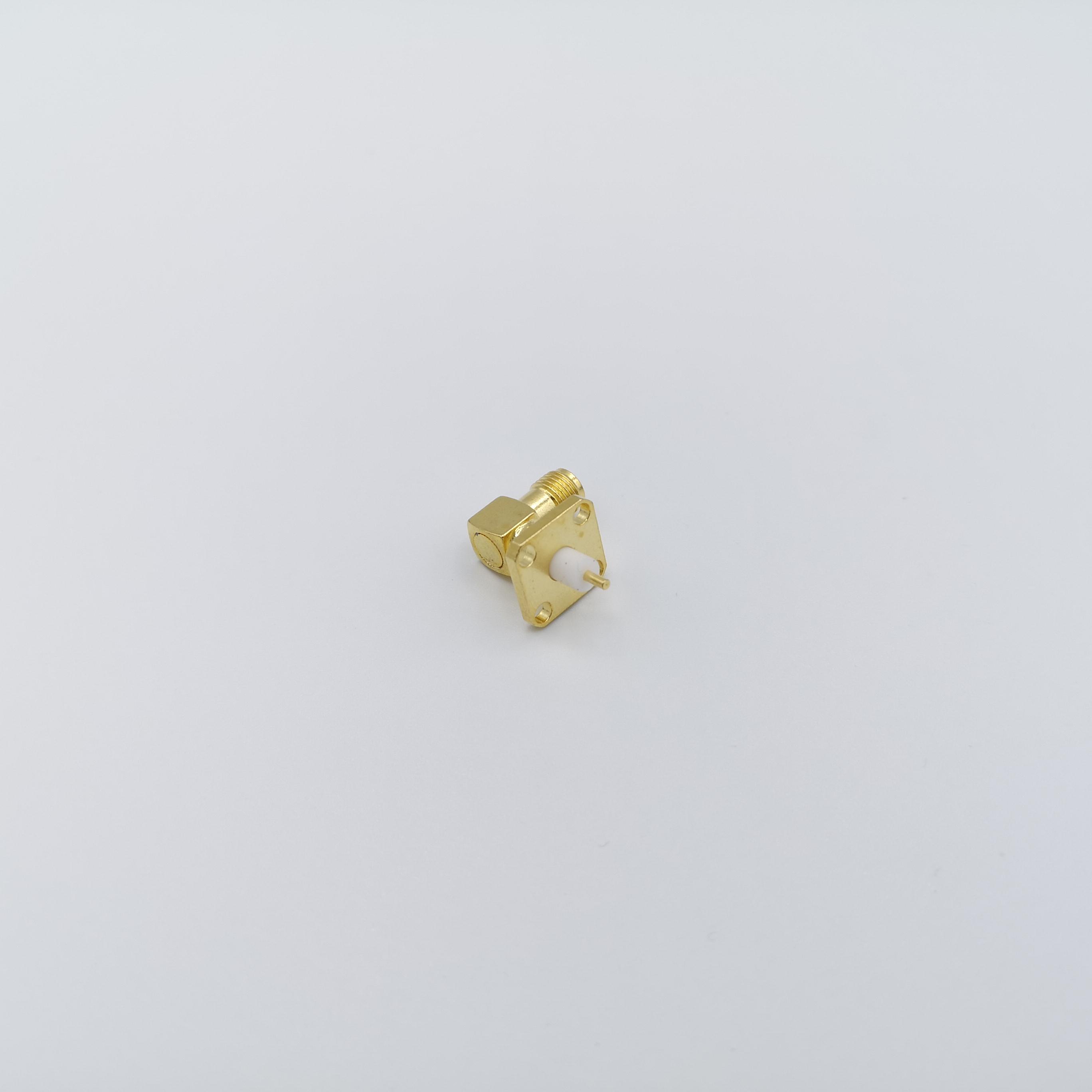 کانکتور SMA مادگی پنلی چهار سوراخه تفلون کوتاه رایت(90درجه) با مغزی(پین) استاندارد می باشد.